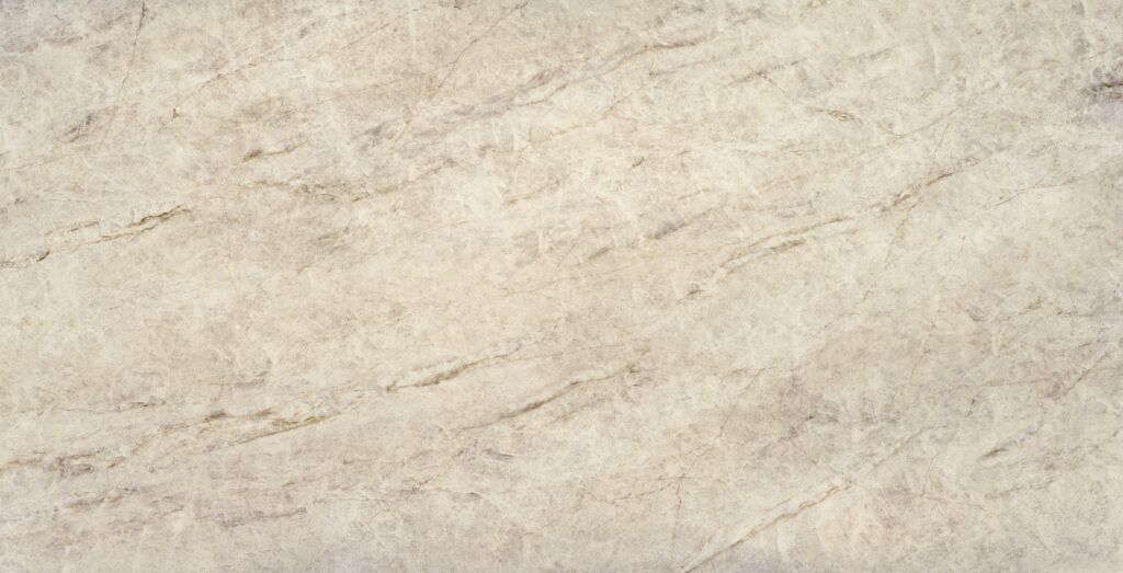 Organic flow of feathery veins. A soft light beige canvas sets a calming tone, while delicate, feathery veins in a slightly darker shade weave through, adding gentle movement and a layer of organic depth. This product is available in 3cm thickness and a Glossy finish. Standard slab size is 62″x128″.