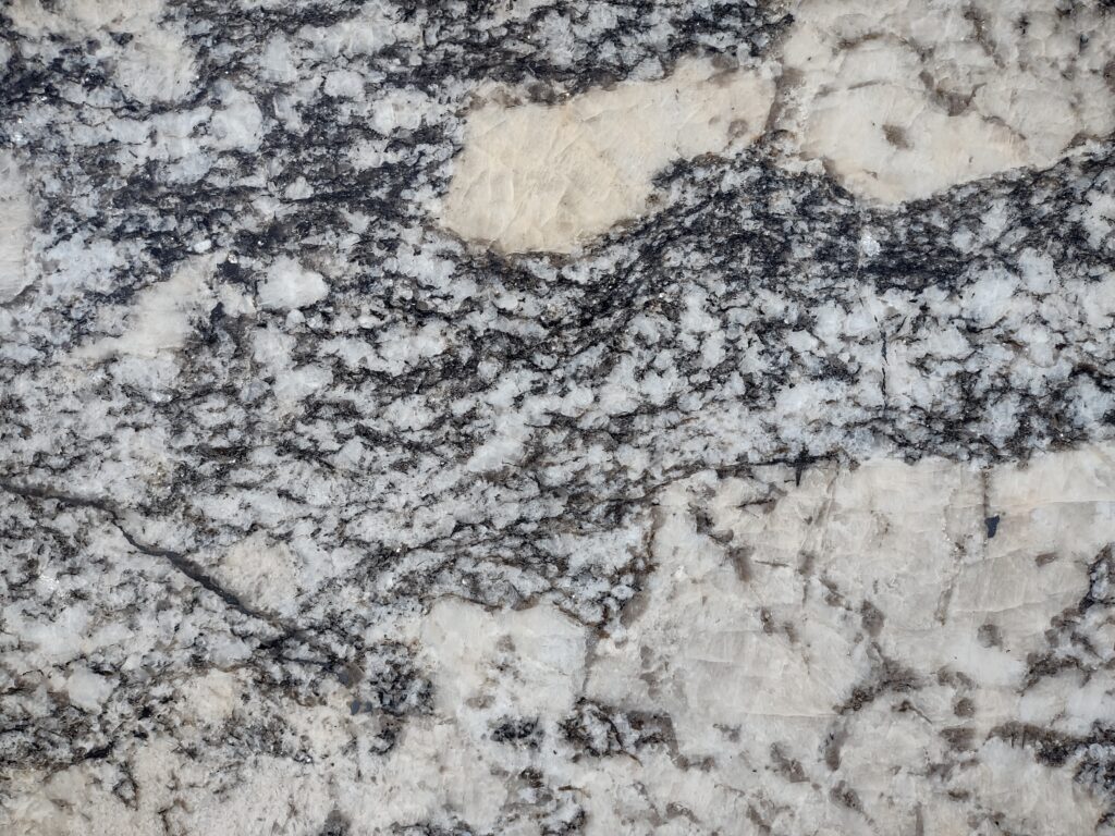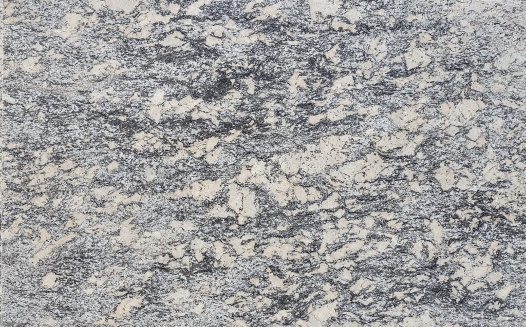 Alpine Valley granite, quarried in India, features warm white backgrounds and scattered beige, charcoal, and black accents. This stone is available in 3cm thickness and a polished finish.