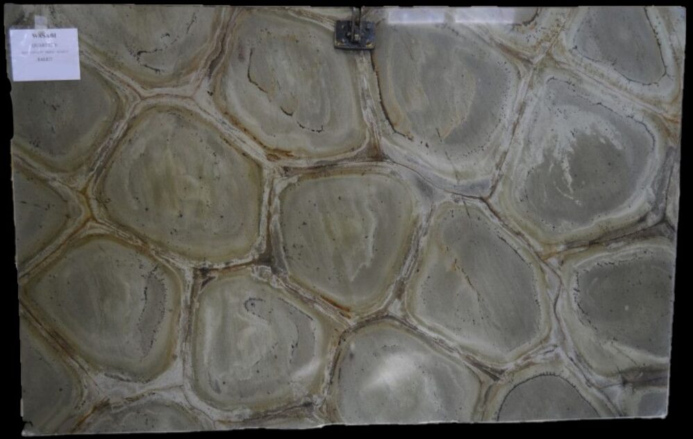 Wasabi quartzite, quarried in Brazil, has a tortous shell pattern of green, grey and gold. This stone is available in 3cm thickness and a polished finish.
