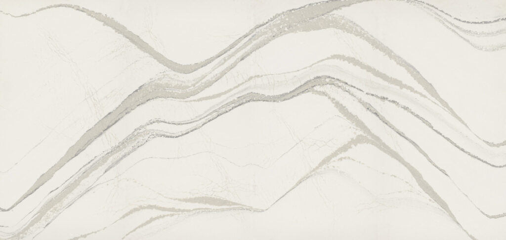 Brittanicca Quartz is made by Cambria Quartz in the USA. Brittanicca offers a creamy marbled background of neutral white that provides a stage on which gray islands and peninsulas meander among intertwining ashen veins dotted with veiled charcoal speckles. This quartz is available in 3cm thickness and a polished finish. Standard slab size is 63″x130″.