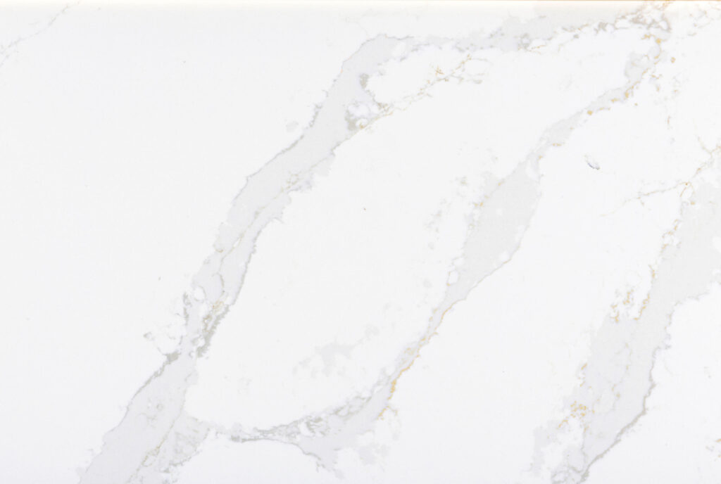 Calacatta Gold Quartz is made by Silestone Quartz in Spain. Calacatta Gold has strong veins of light gray, light beige, and gold that strike through the surface like a bolt of lightning as the surface resembles natural marble stone. This quartz is available in 3cm thickness and a polished and suede finish. Standard slab size is 63″x128″.