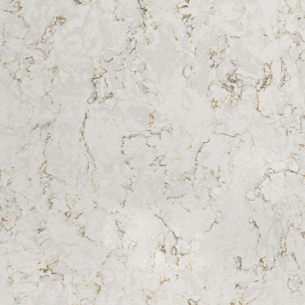 Lusso, made by Silestone Quartz in Spain, is predominately white in color, with a beautiful and distinct pattern featuring a neutral pallet. Veins of charcoal, gold, bronze, and light beige provide dimension and versatility to the stone, while splotches of light cream and faint gray can be seen throughout.. This quartz is available in 3cm thickness and a polished finish. Standard slab size is 63″x128″.