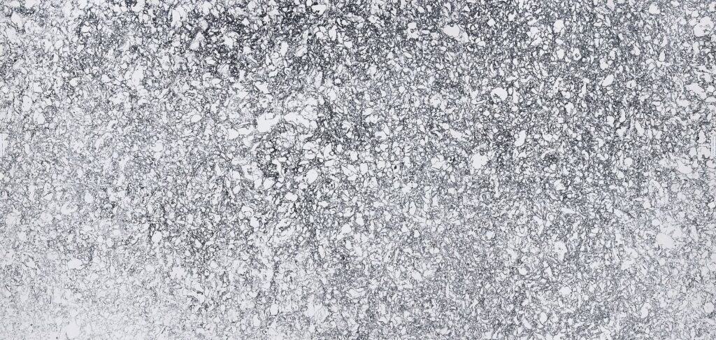 Rose Bay Quartz is made by Cambria Quartz in the USA. A white foundation is infused with robust black marble veining, creating a striking abstract effect where opposites definitely attract. This quartz is available in 3cm thickness and a polished finish. Standard slab size is 63″x130″.