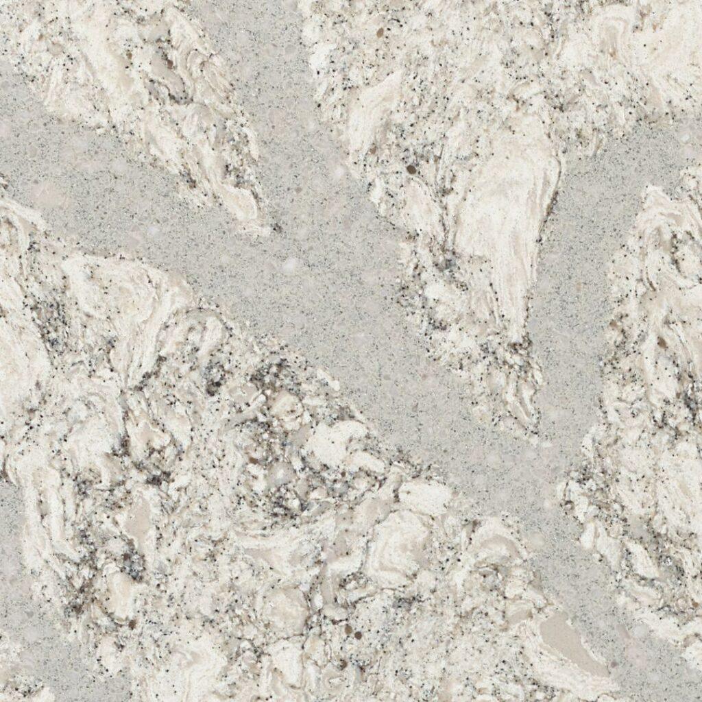 Summerhill Quartz is made by Cambria Quartz in the USA. Cloudlike with pillows of white, Summerhill mixes several shades of white with large veins of white crystals, silver sparkle, and a light dusting of black throughout. This quartz is available in 3cm thickness and a polished finish. Standard slab size is 53″x120″.