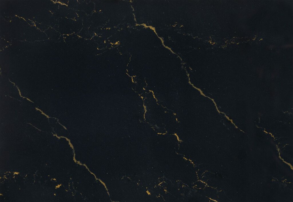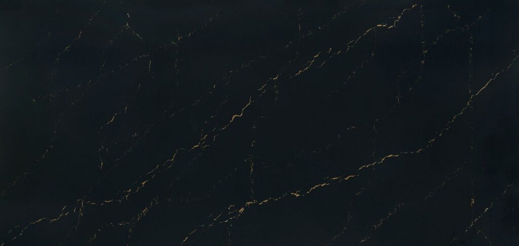 Woodcroft Quartz, made by Cambria Quartz in the USA, offers a bold and black base with sparkling golden lightning strikes and paler metallic streaks that drizzle like rain against a window pane. This quartz is available in 3cm thickness and a polished finish. Standard slab size is 63″x130″.